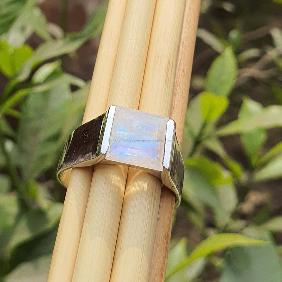 Men's Square Cut Rainbow Moonstone Ring 925 Sterling Silver for Engagement Wedding or Anniversary Stylish Jewelry Gift for Him