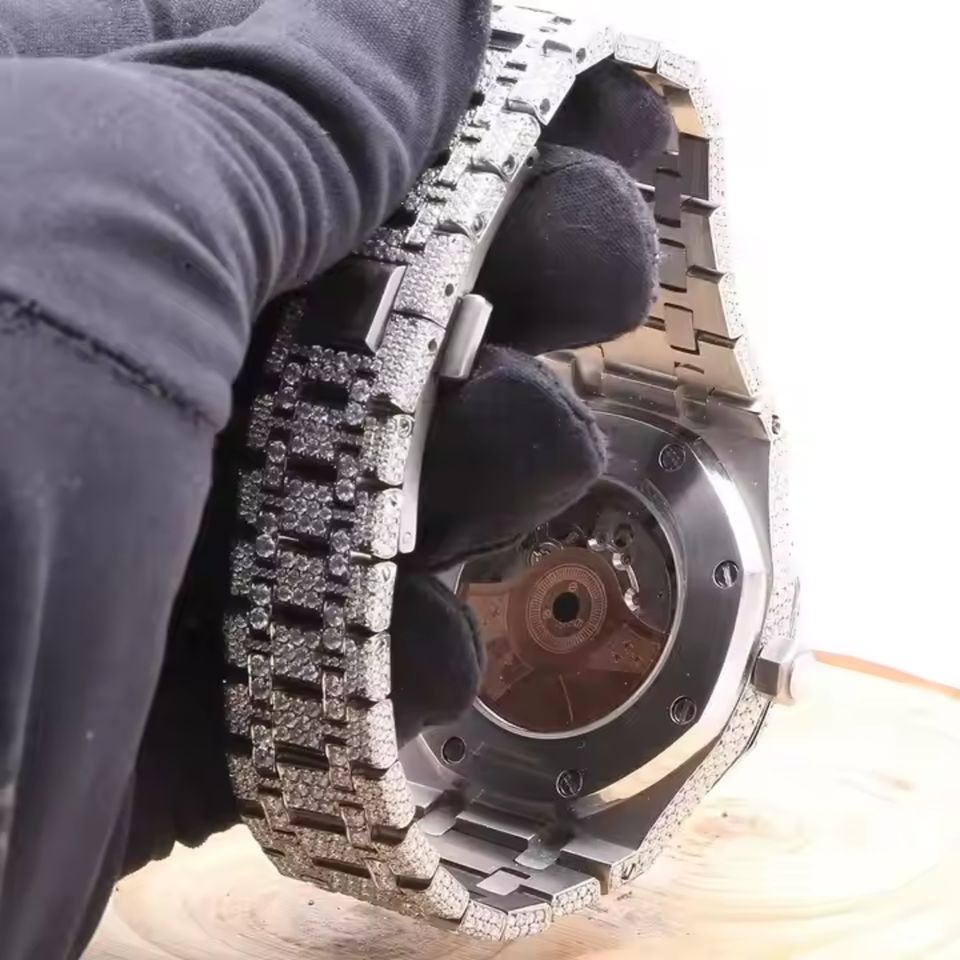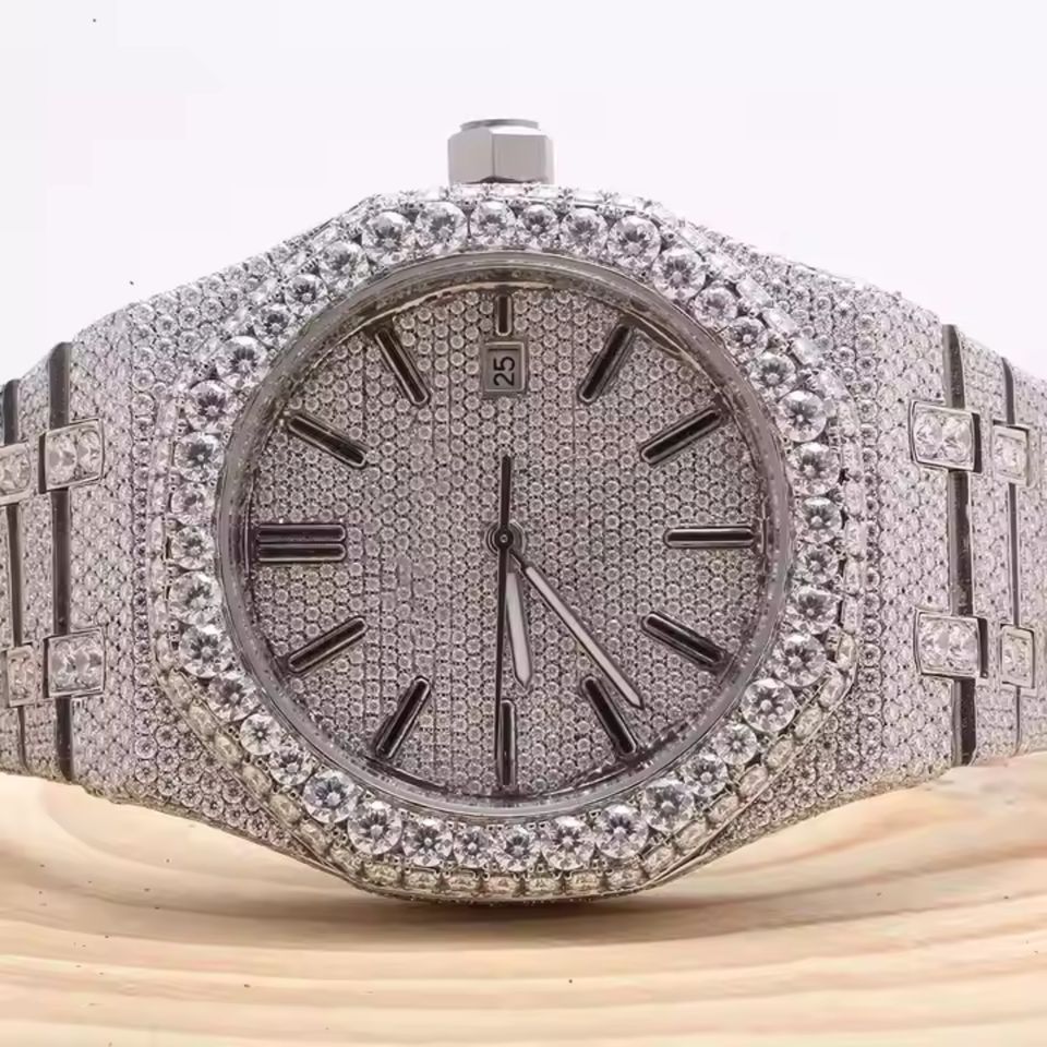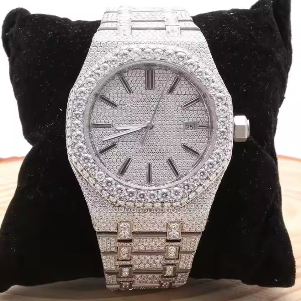 Men's Stainless Steel Mechanical Watch with VVS Clarity Moissanite Diamond Quartz Movement for Sports and Business