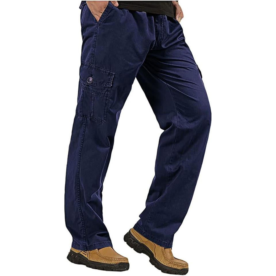 Men's Straight Casual Cargo Pants Baggy Chino Trousers Zip-Fly Ribbed Leg Opening Elastic Waist Pants Side Pockets Plain Dyed
