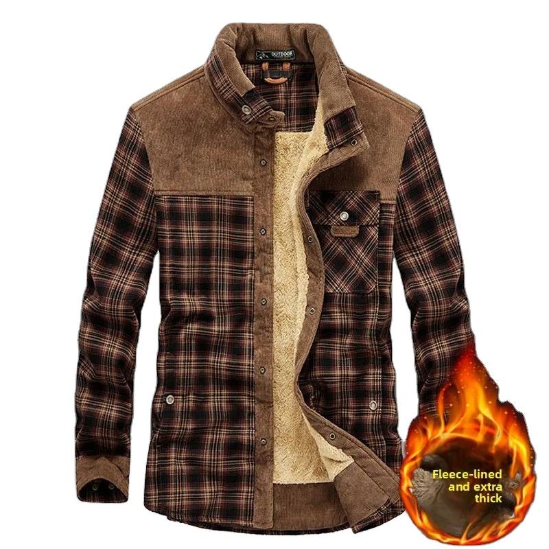Men's Stylish Business Casual Cotton Shirt Autumn Winter Thickened Plaid Fleece Lining Long Sleeve Loose Fit Casual Long Shirt