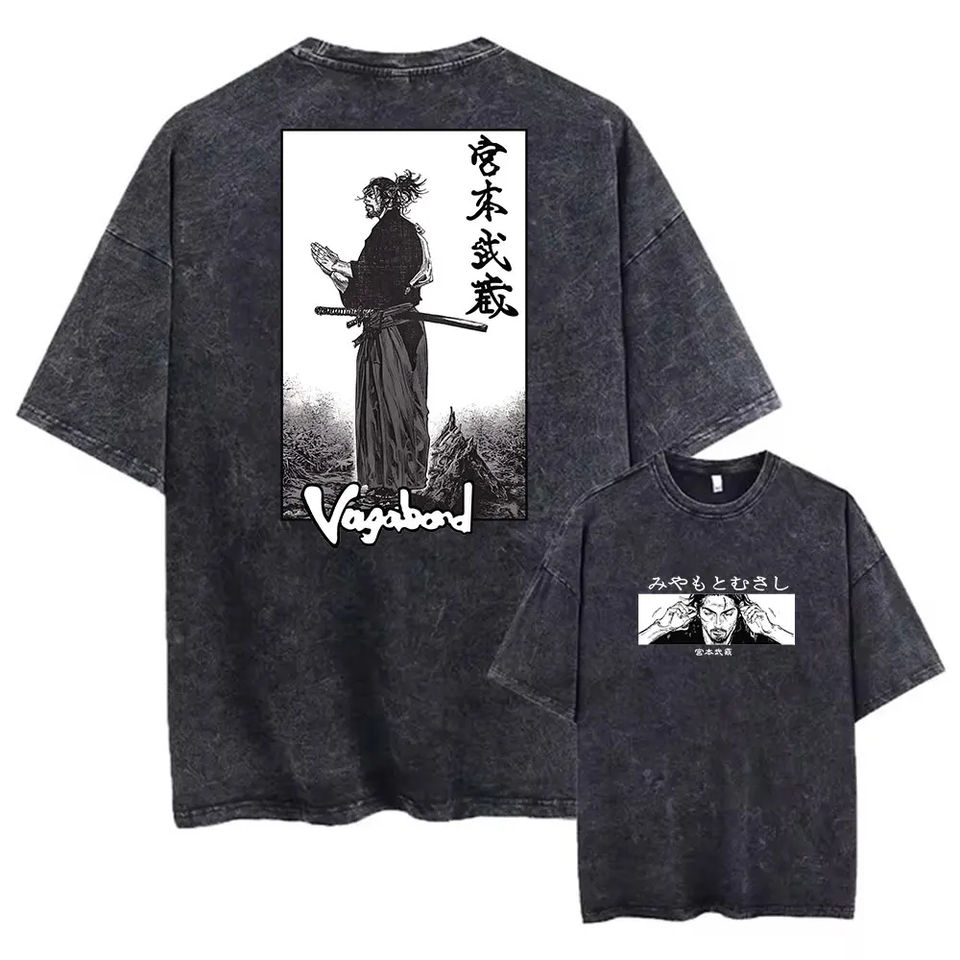 Men's Summer Casual Cotton T-Shirt Vintage Harajuku Washed Black with Anime Vagabond Graphic Print Loose Fit Streetwear Top