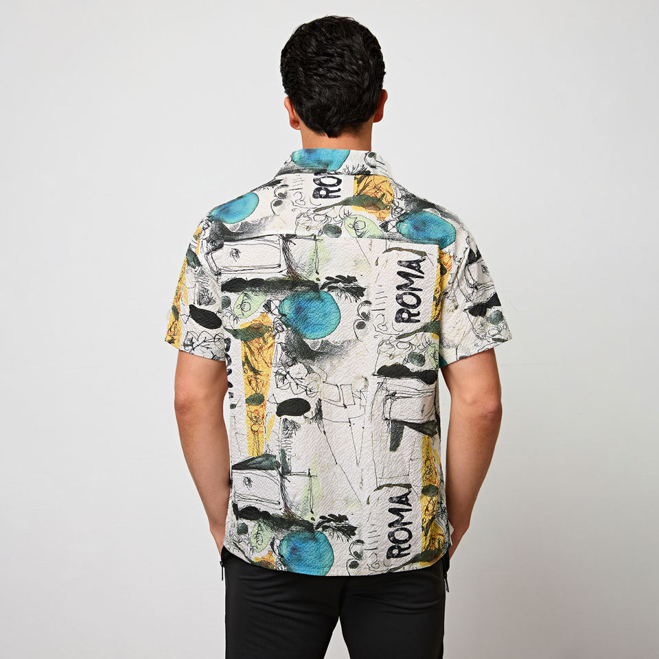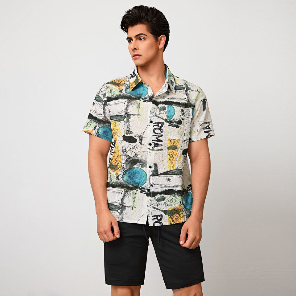 Men's Summer Casual Short Sleeve Shirt with Pleated Texture Print and Buttons Knitted Garment Dyed Featuring a Pocket