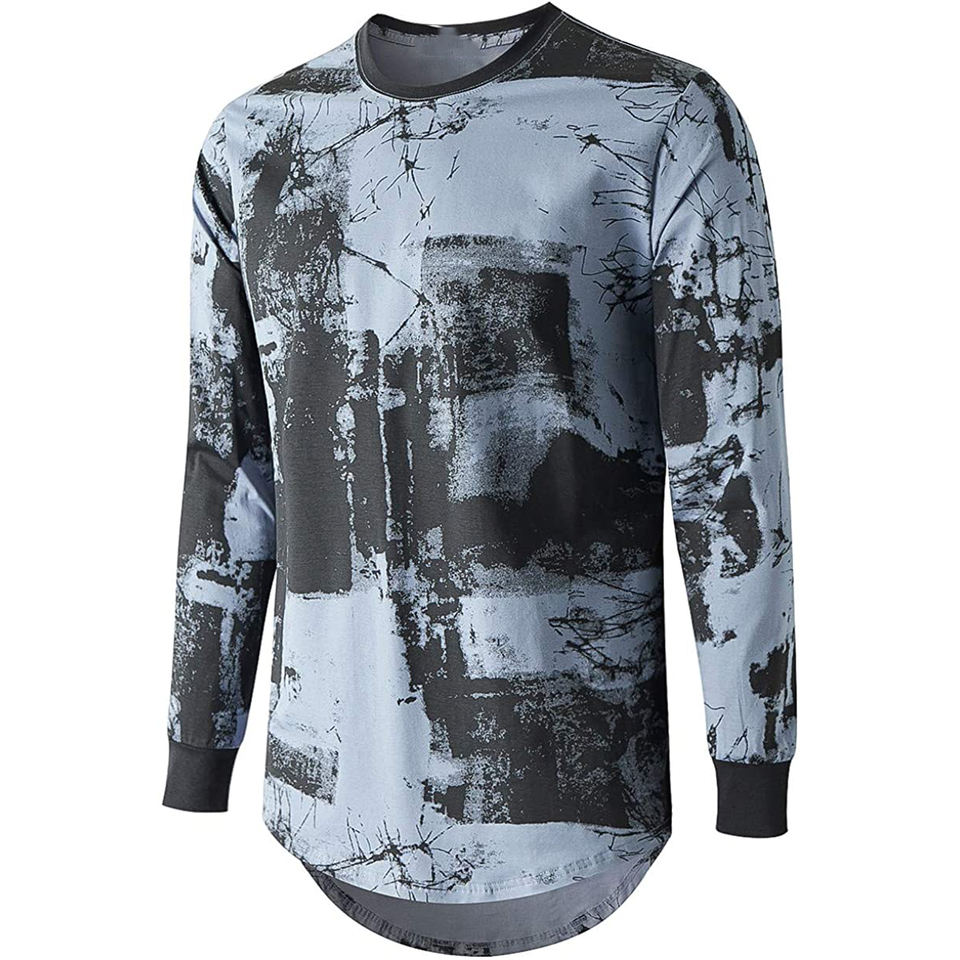 Men's Summer Hip Hop Ripped Round Hemline Solid Long Sleeve Slim Fit T Shirt Custom Allover Print Activewear