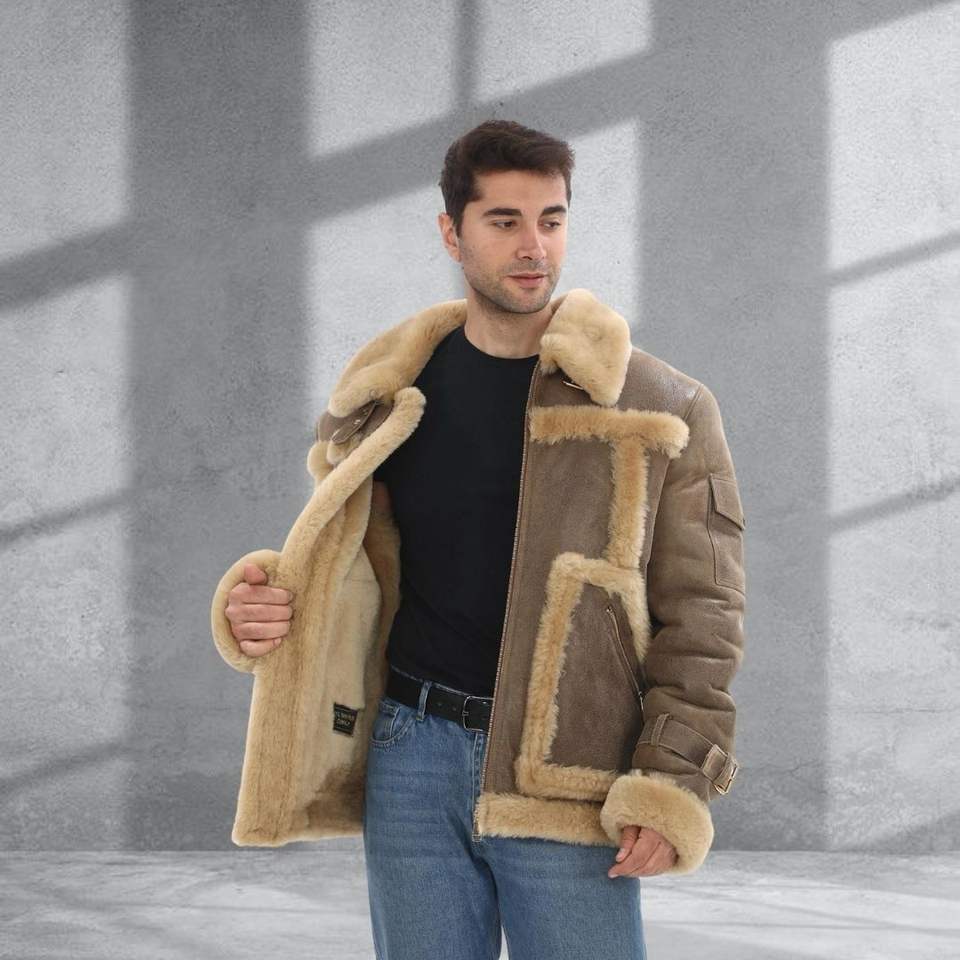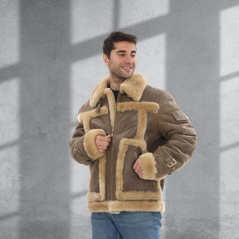 Men's Tan Shearling Aviator Jacket Handmade Genuine Sheepskin Winter Pilot Coat with Ribbons Custom Size XS OEM/Wholesale Turkey