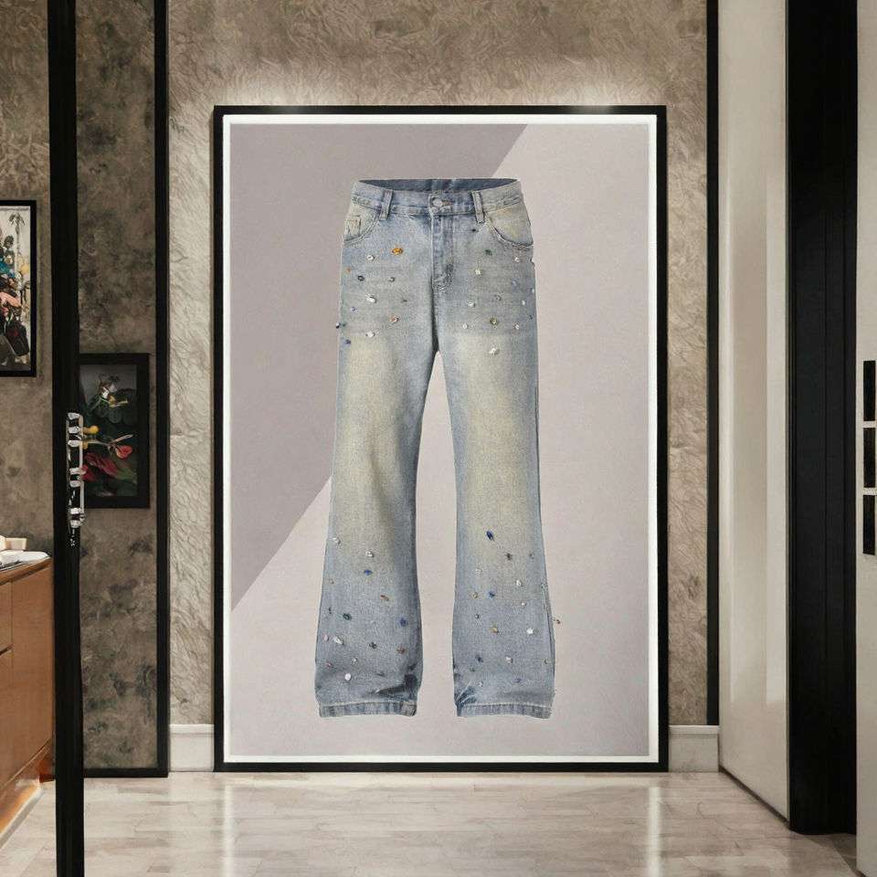 Men's Trendy Loose Wide Leg Light Wash Denim Straight Baggy Pants Colorful Rhinestone Streetwear Diamond Mid Winter Spring