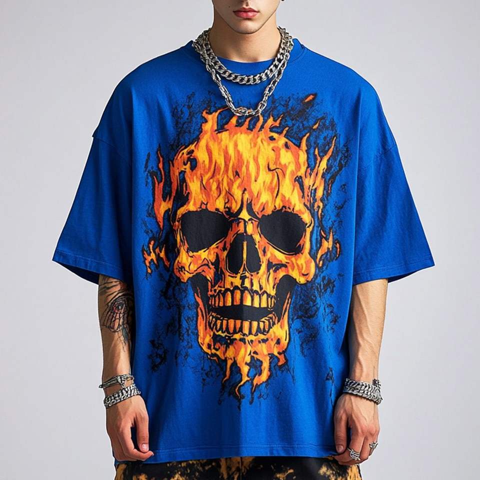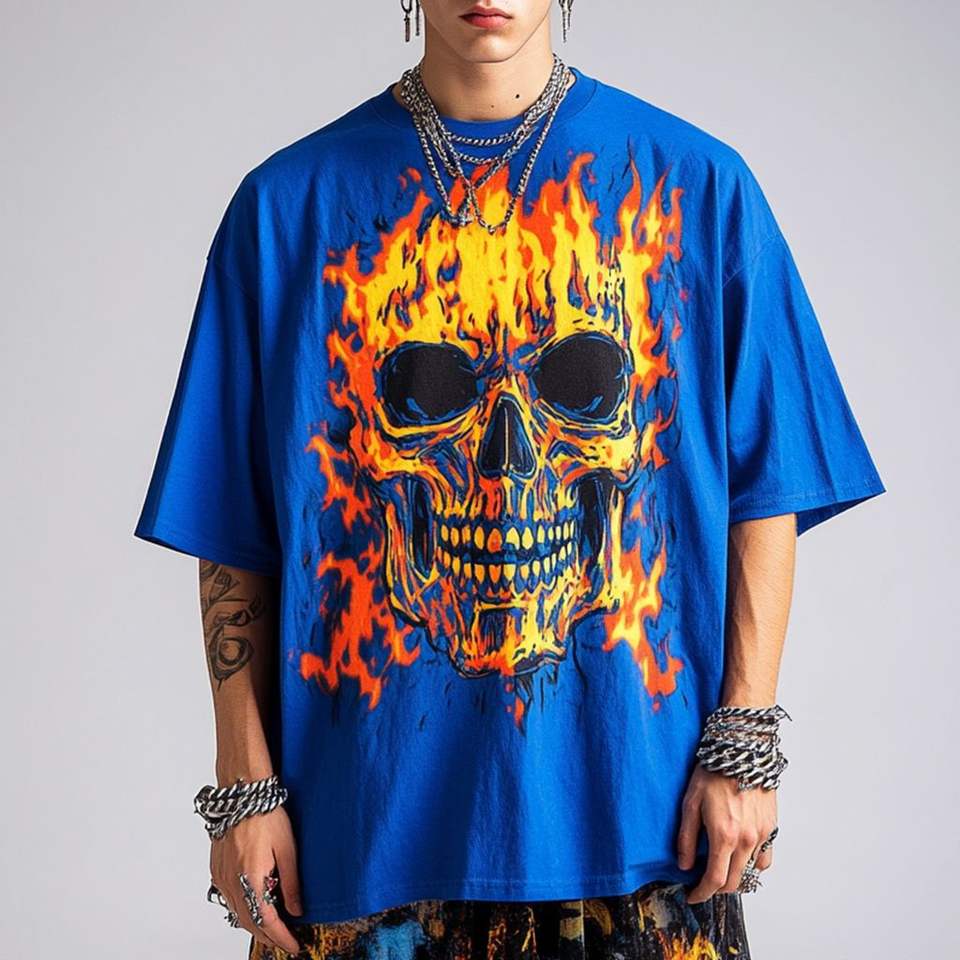 Men's Trendy Oversized Breathable Graphic Tees New Arrival Hip Hop Streetwear Flame Skull Print Short Sleeve