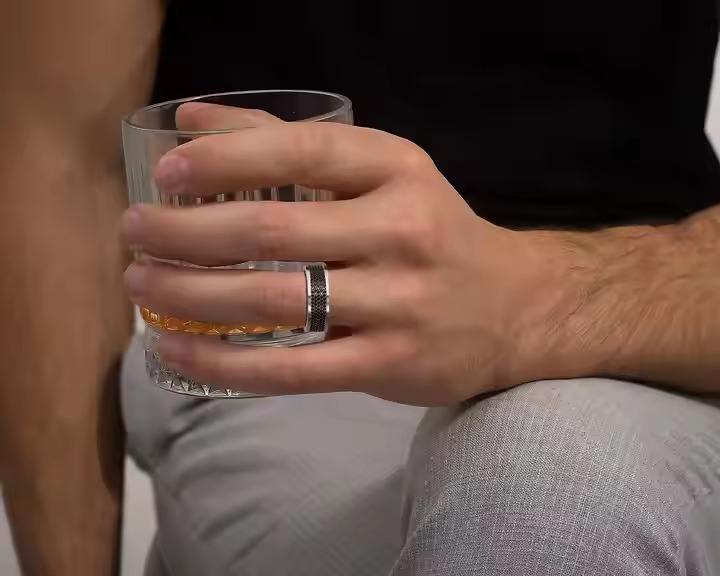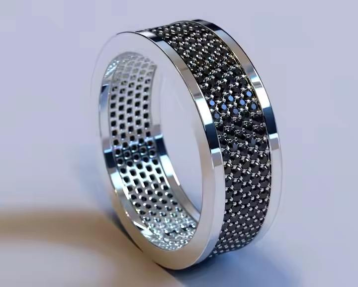 Men's Unique 14K White Gold Wedding Band Eternity Bejeweled Ring with Black Diamond Shimmer for Anniversary Vermeil Fine Rings