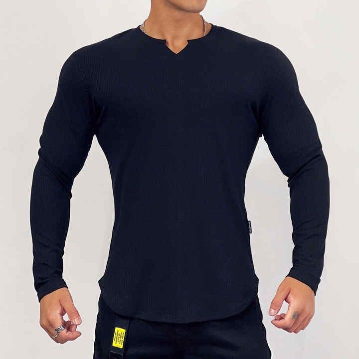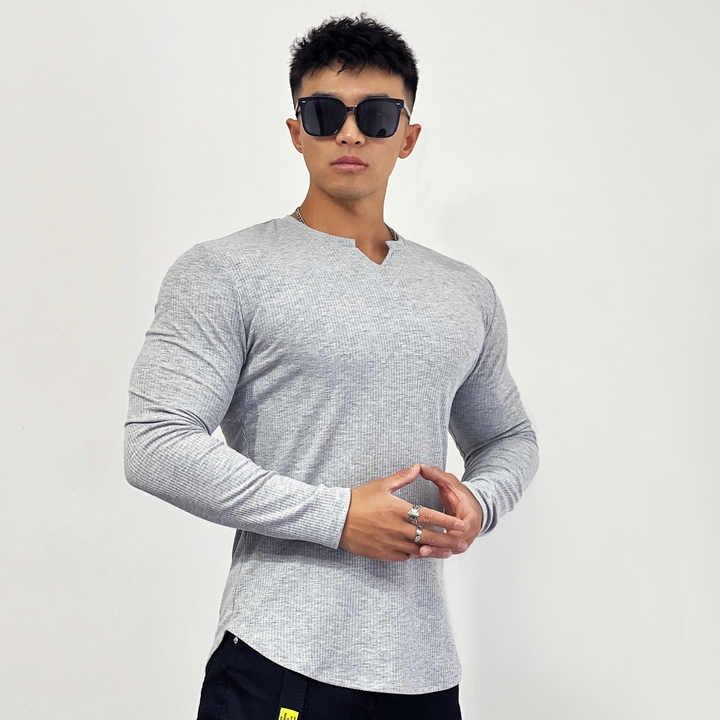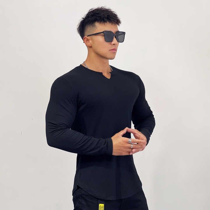 Men's V-Neck Long Sleeve Fitness T-Shirt Printed Sport Tshirts for Outdoor Basketball Running & Leisure Knitted Fabric