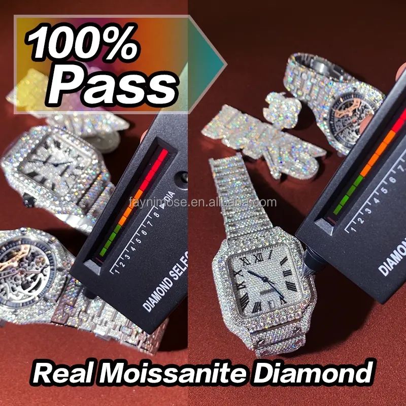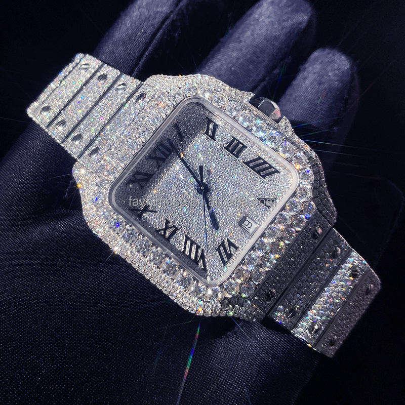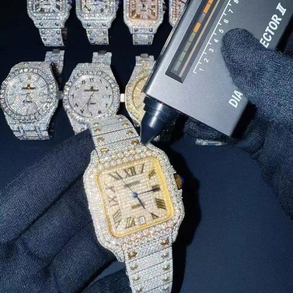 Men's VVS Moissanite Watch Square Stainless Steel Band Hip Hop Style Iced out for Analog Dial Display