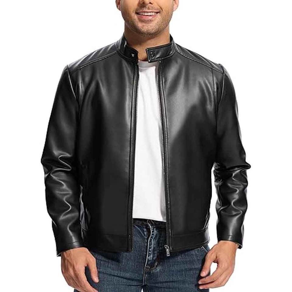 Men's Vintage Biker Motorcycle Leather Jacket Stand Collar Sports Jacket with Zipper Closure for Winter Sports