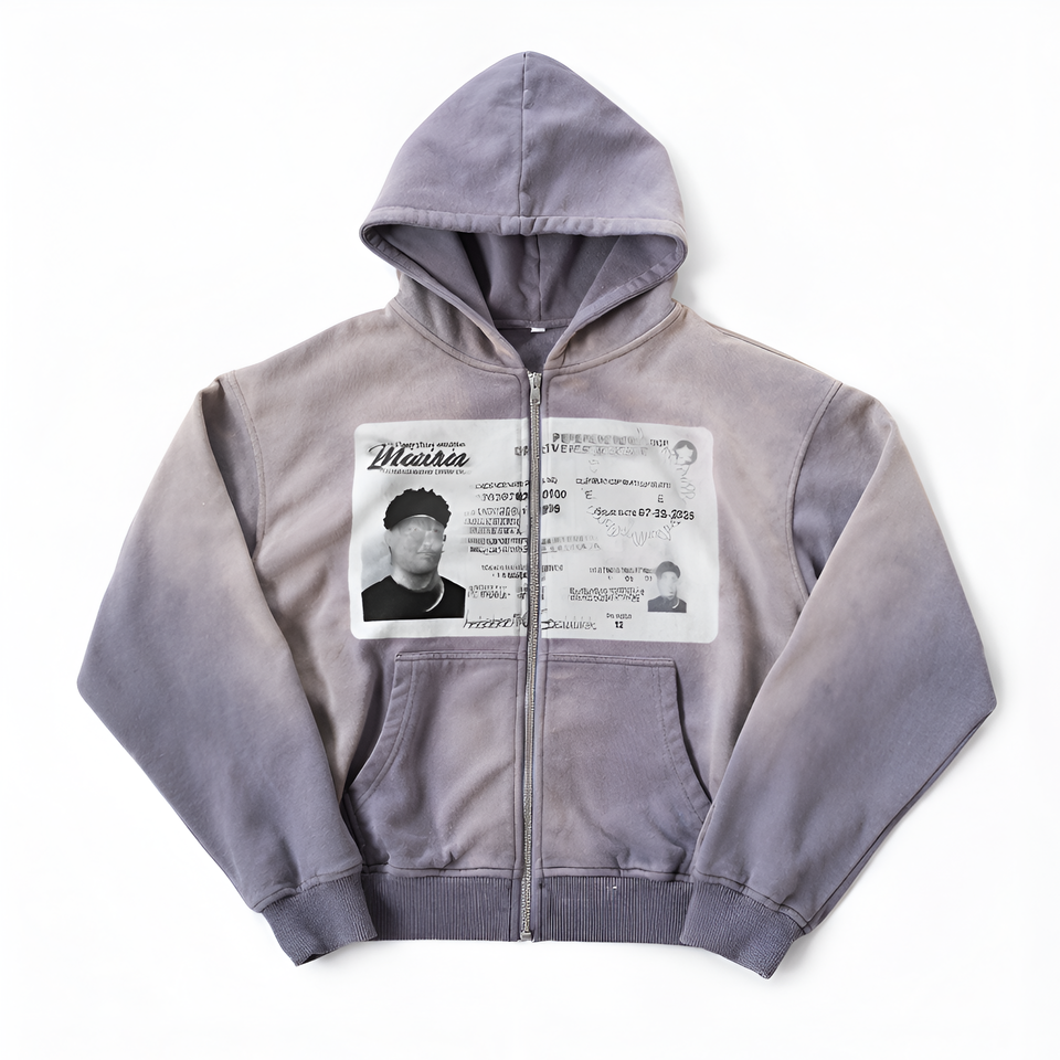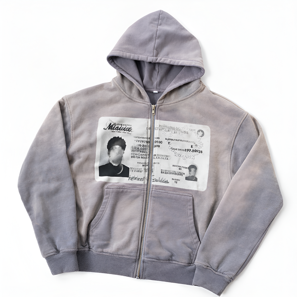 Men’s Vintage Grey Zip Up Hoodie with Abstract Document Style Graphic Print, Washed Finish, Long Sleeve Casual Streetwear Top