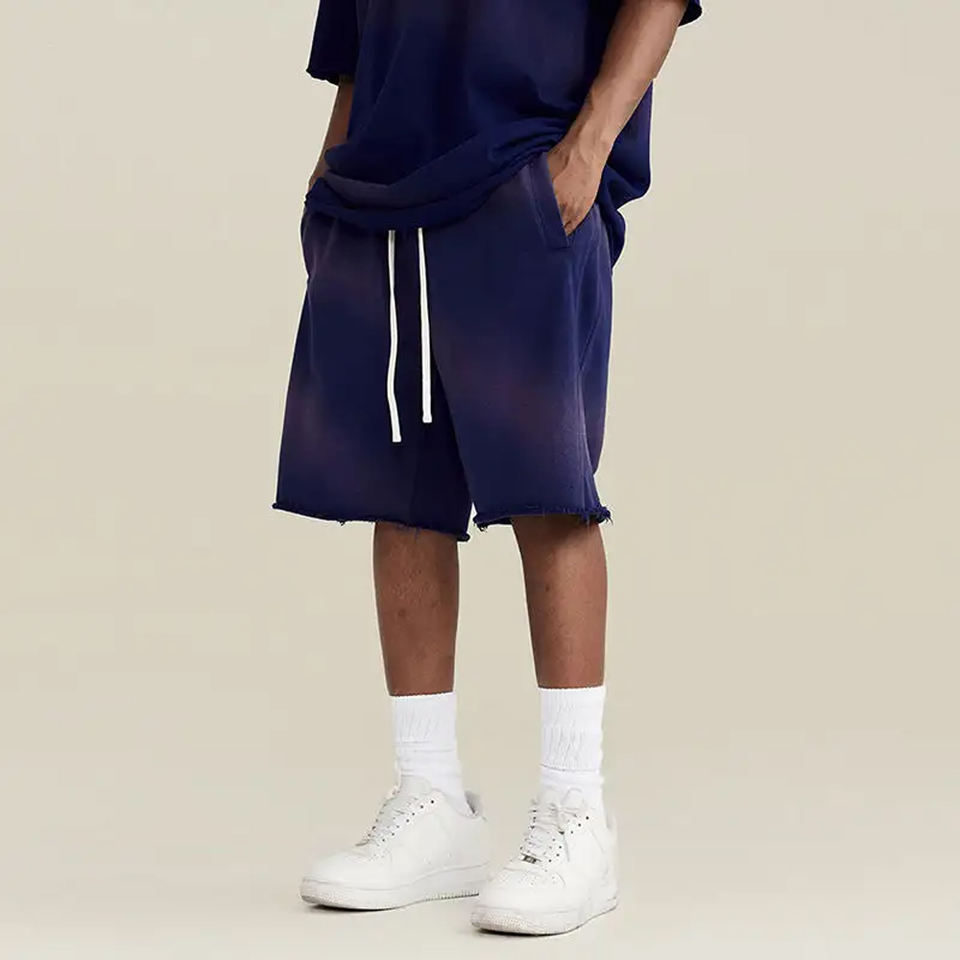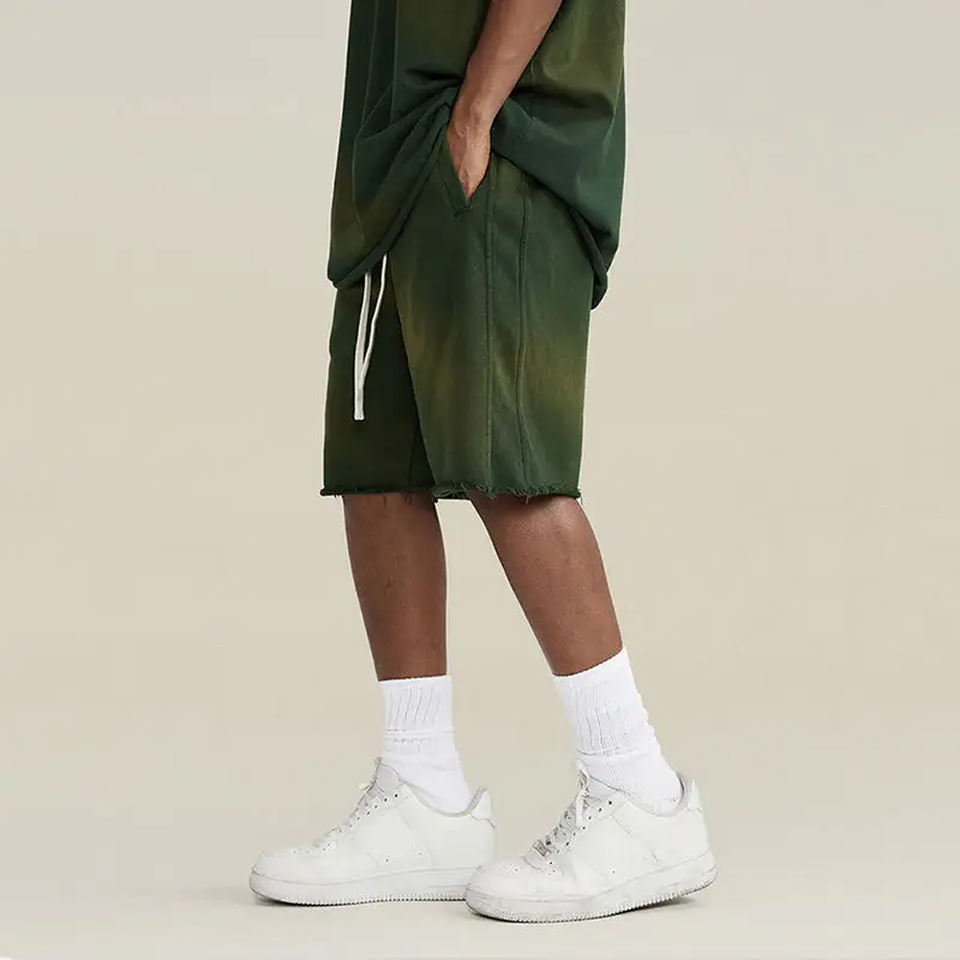 Men's Eco-Friendly Mid Waist Elastic Vintage Sun Faded Shorts 160g Heavy Acid Washed Gradient Breathable High Street