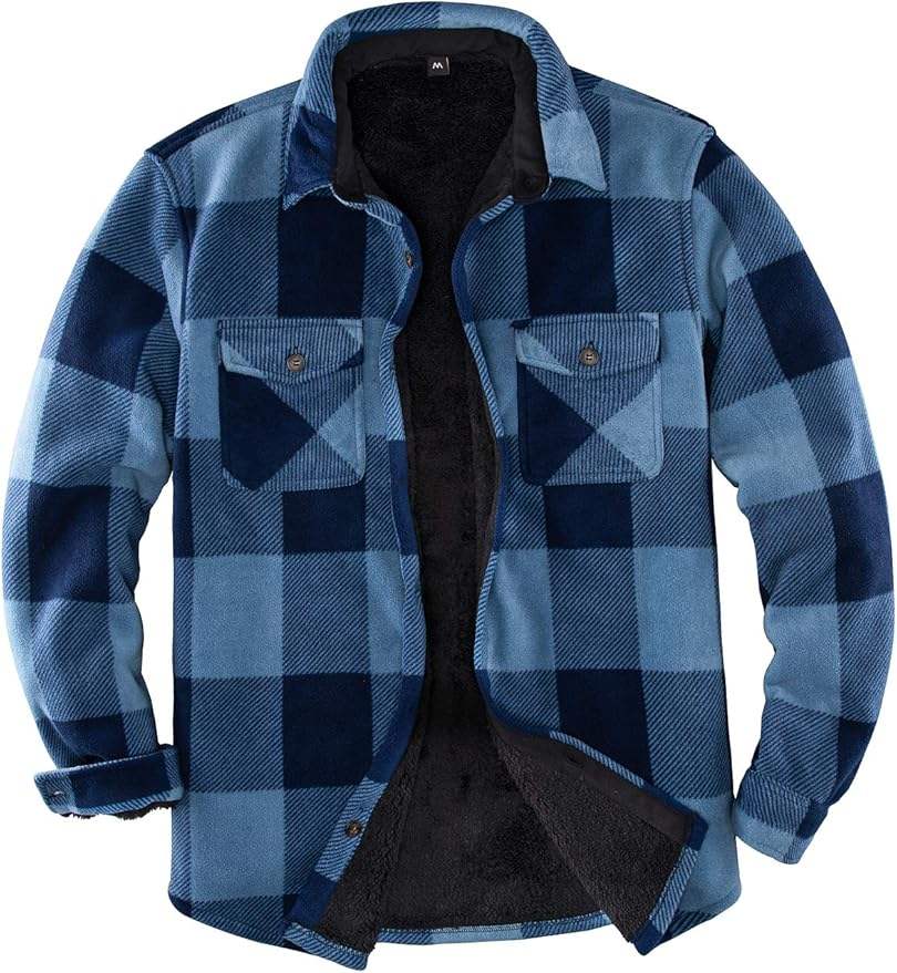 Men's Warm Sherpa Lined Plaid Flannel Shirt Jacket with Turn-Down Collar