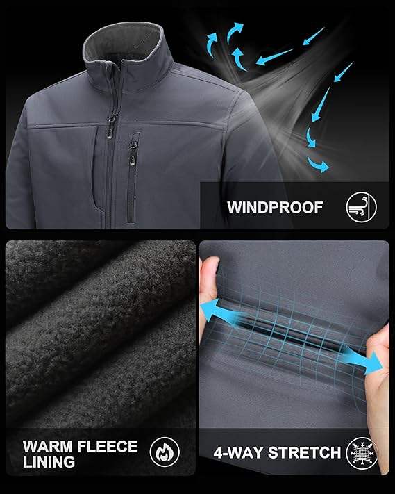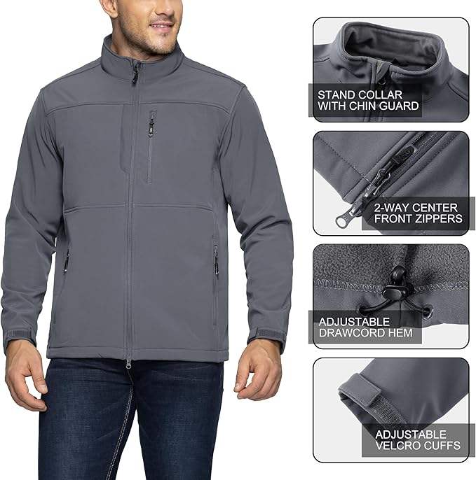 Men's Waterproof Canvas Softshell Jacket Stand Collar Front Warm Fleece Lined Windbreaker Lightweight for Travel Hiking Golf