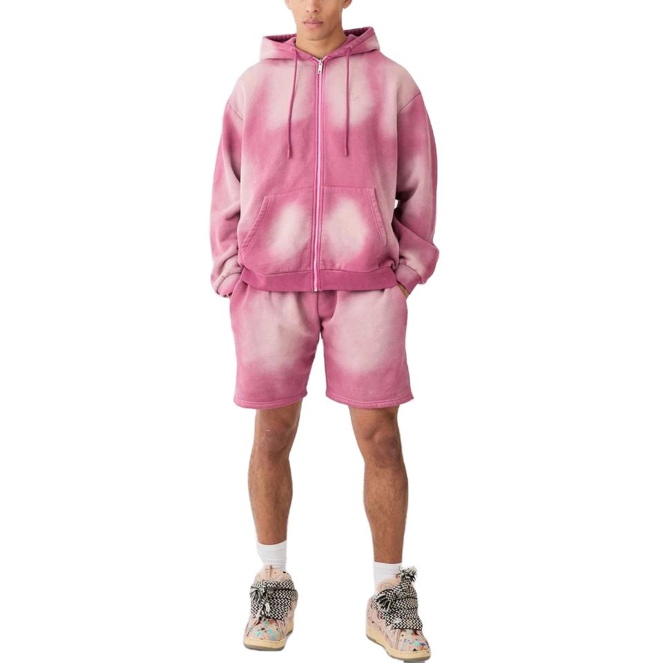 Men's Winter Casual Custom Embroidery Logo 100% Cotton Fleece Breathable Shorts Set Sun Faded Men Drop Shoulder Zip-Up Hoodie