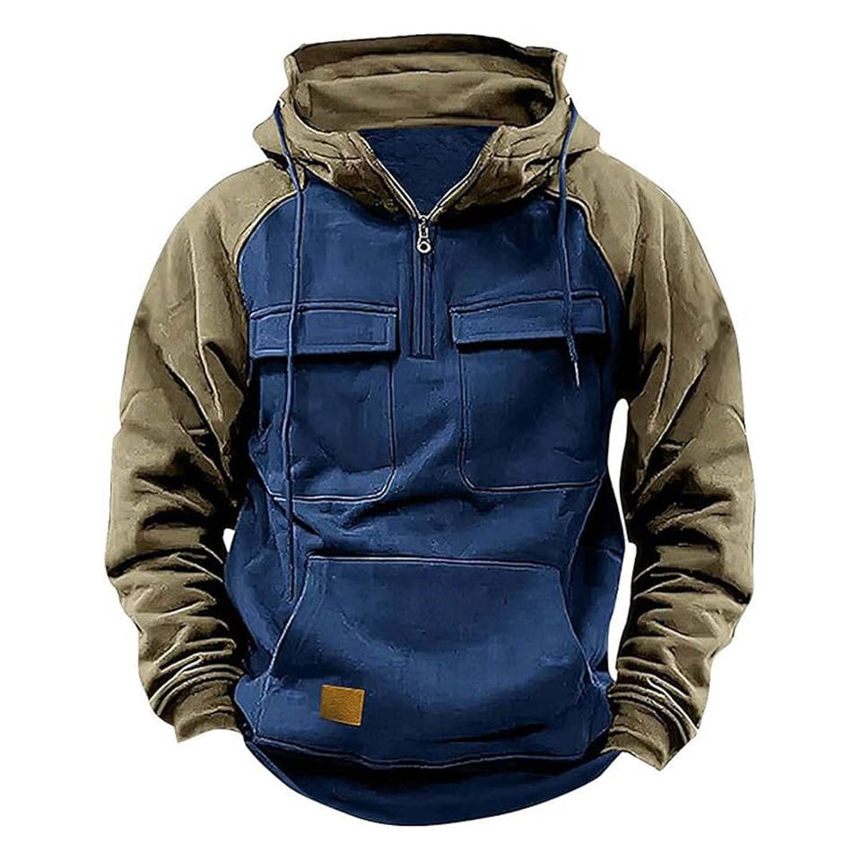 Men's Winter Vintage Long Sleeve Hoodie Top with Stand Collar Half Zipper and Multi-Pocket for Outdoor Workwear