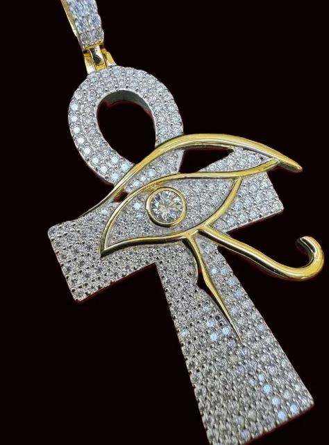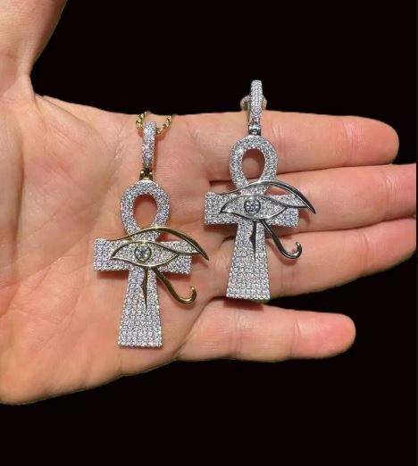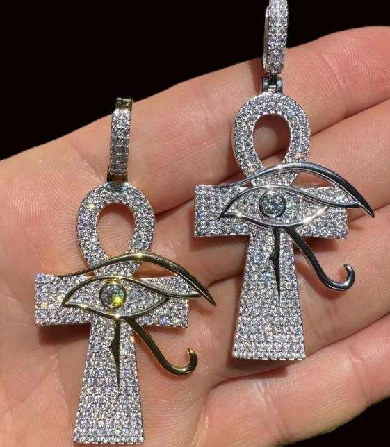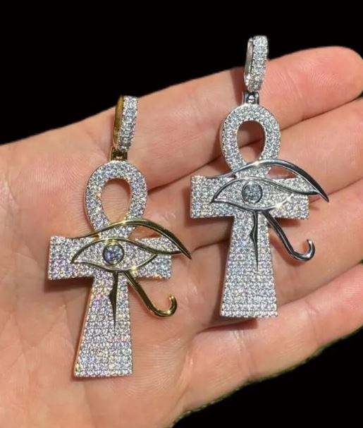 Men's Women's Solid 925 Sterling Silver Iced MOISSANITE Ankh Cross Eye Horus Pendant Silver Plated Rhodium Finish IGI Certified