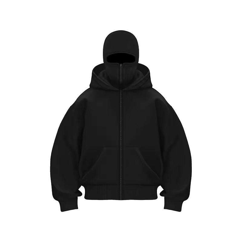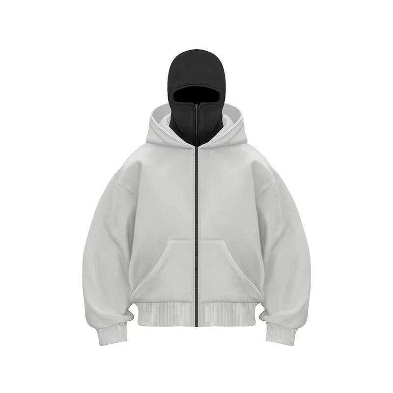 Men's Y2K Streetwear Casual Cotton Printed Full Zip Face Mask Balaclava Hoodie Trendy Double Hooded Design