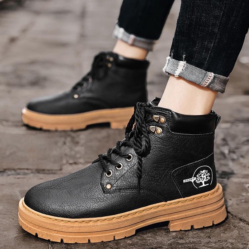 Men's black high top work shoes with non slip wear resistant sole suitable for outdoor use in spring and fall seasons