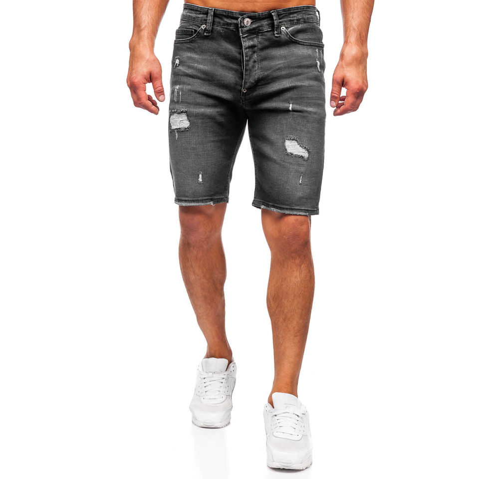 Men vintage light blue denim shorts with raw edge hem zipper closure and crystal embellishments casual streetwear
