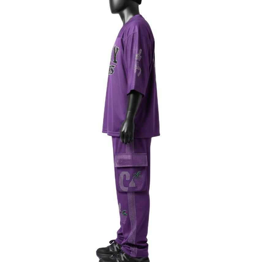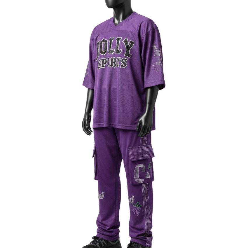 Mens 180 GSM Premium Polyester Mesh Jersey Pant Set Purple Breathable Rhinestone Heat Transfer Logo Mesh Jersey and pant men's