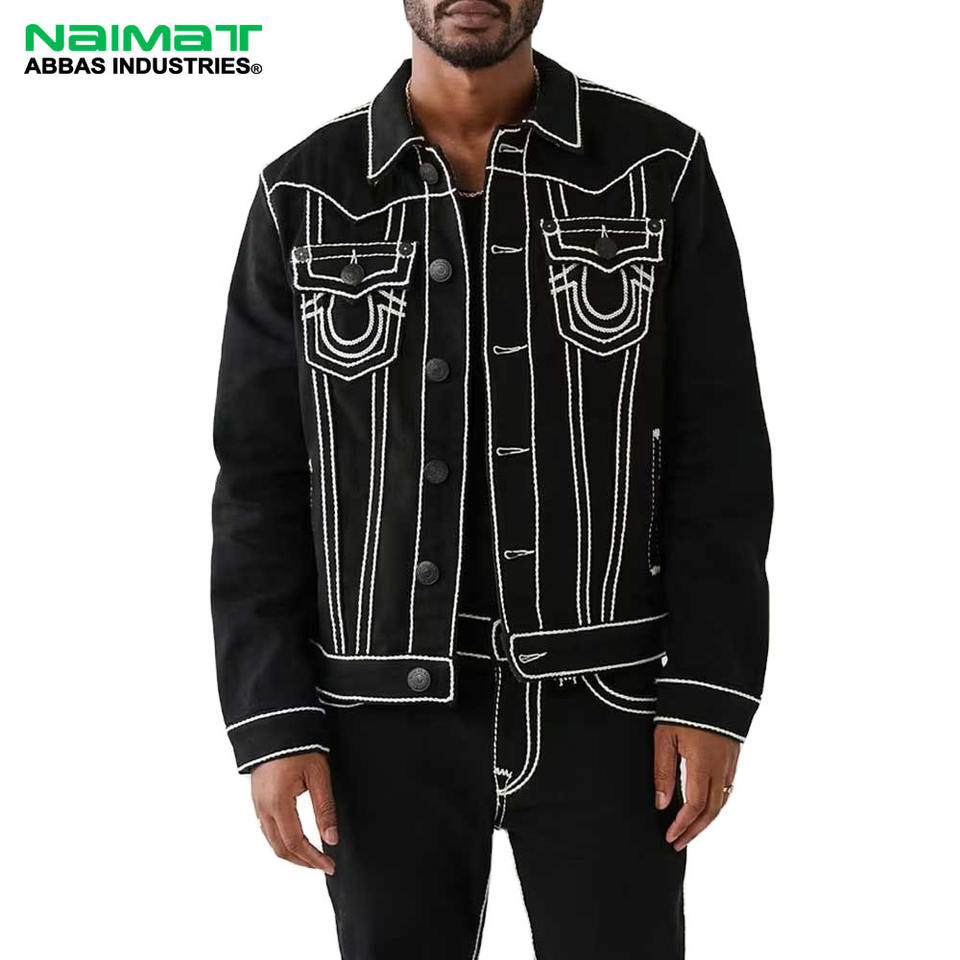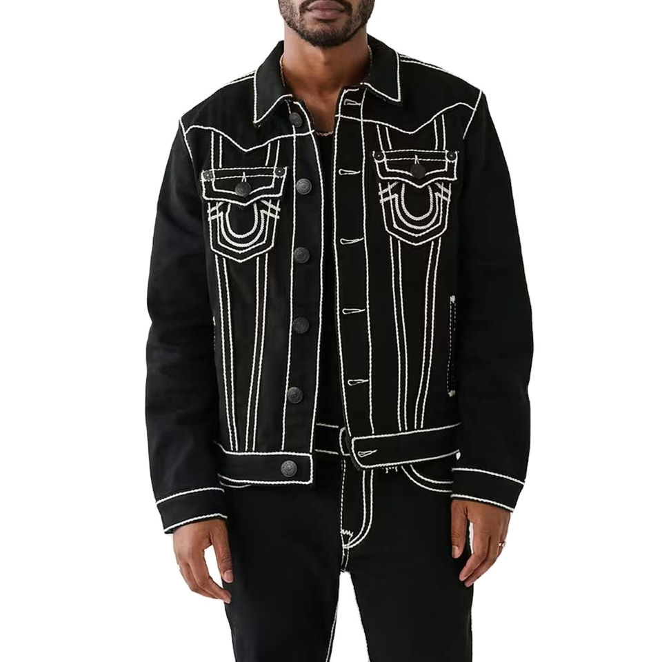 Mens Black Denim Jacket with White Contrast Stitching Heavyweight Cotton Jean Coat Streetwear Fashion Urban Outerwear