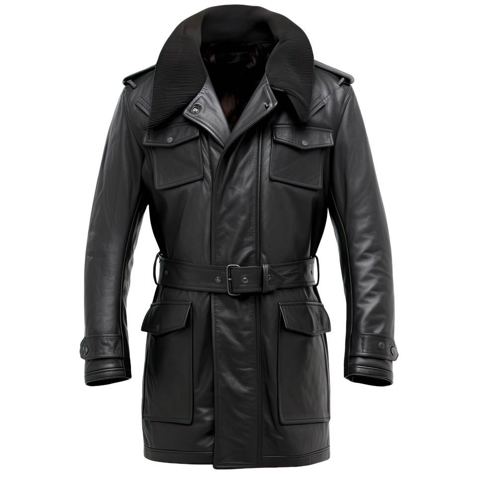 Mens Black Genuine Sheepskin Stylish Shirt Collar Lightweight Office Outerwear Mid Length Belted Aviator Style Leather Coat