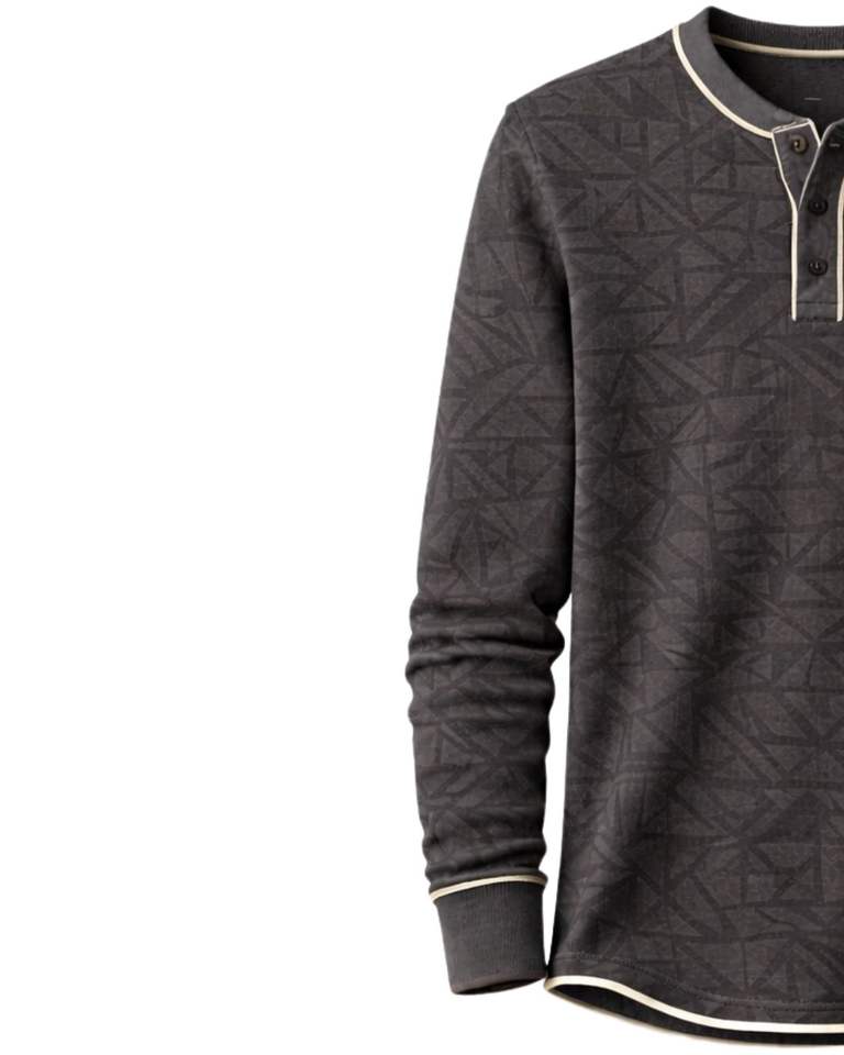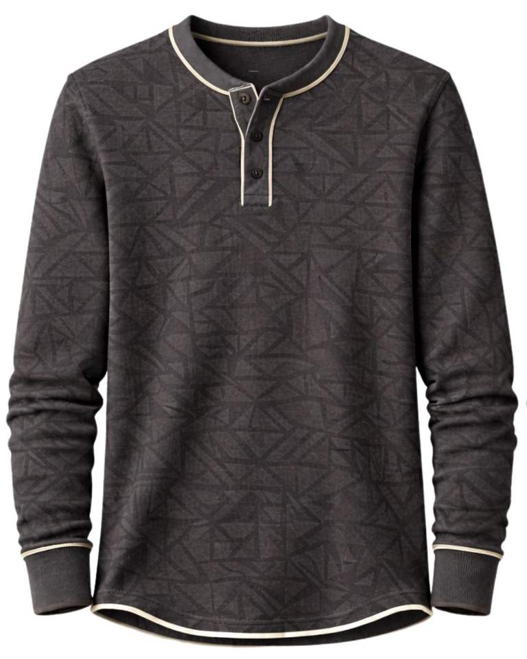 Mens Black Geometric Printed Henley Pullover Sweatshirt Long Sleeve French Terry Regular Fit Casual Top For Men Winter Wear New