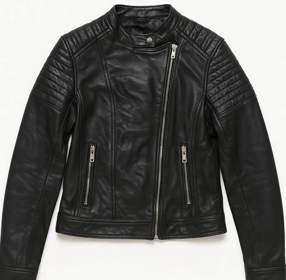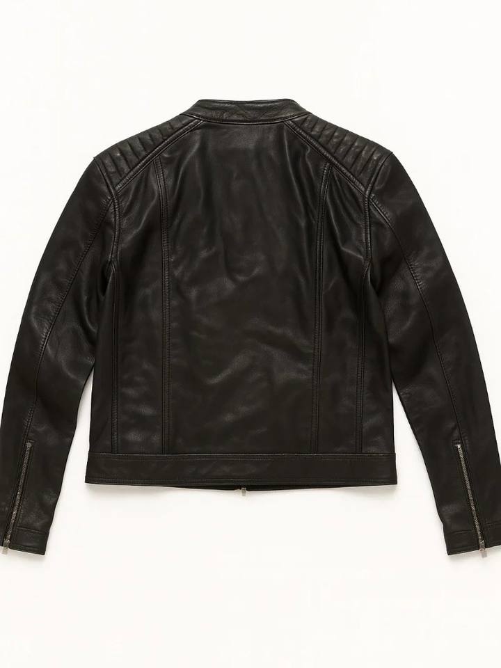 Mens Black Leather Biker Jacket Cafe Racer Motorcycle Style Quilted Mandarin Collar Slim Fit Asymmetrical Zipper Eco-Friendly
