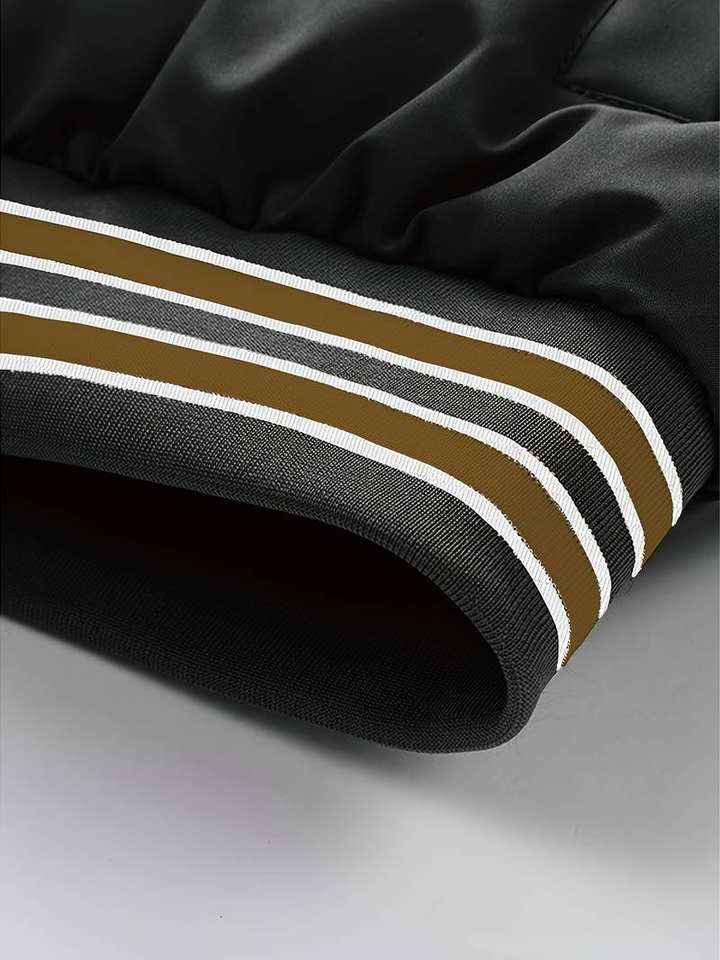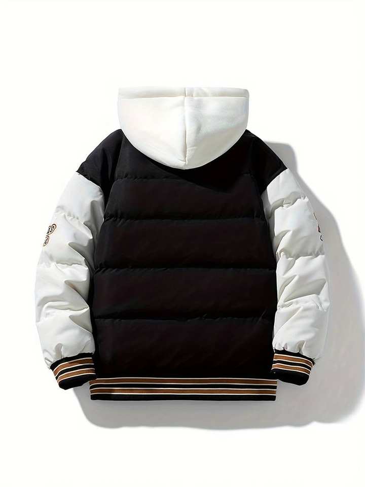 Mens Black and White Varsity Puffer Jacket with Hood Letter Patch Design Warm Quilted Winter Coat Casual Streetwear Outerwear