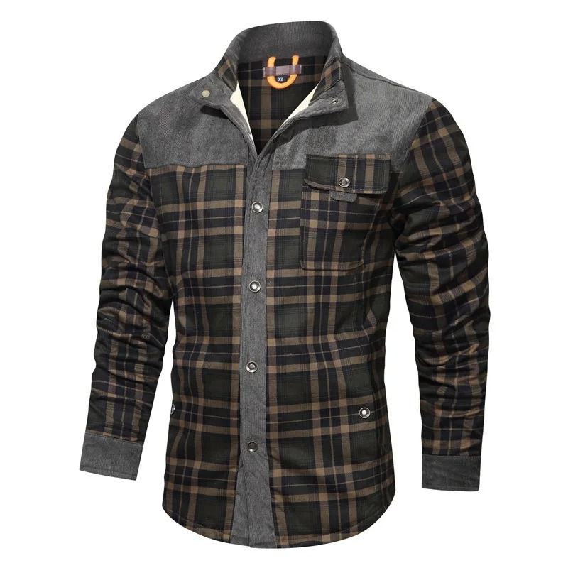 Mens Blue Green Plaid Flannel Shirt Outdoor Activity Fleece Lined Tactical Flannel Jacket Thermal Top
