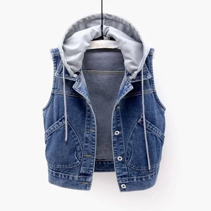 Mens Breathable Hooded Denim Vest Sleeveless Jeans Jacket Short Waistcoat Button up Cotton Casual Fashion Outerwear Large Size