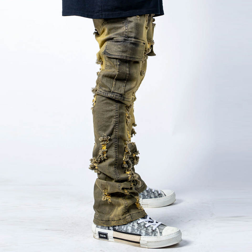 Mens Cargo Jeans Ripped Distressed Denim Pants Multi Pocket Streetwear Slim Fit Stylish Fashion Casual Trendy Trousers