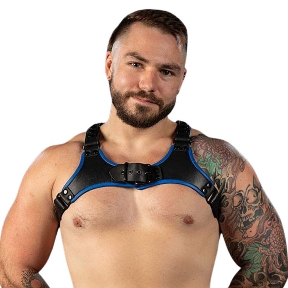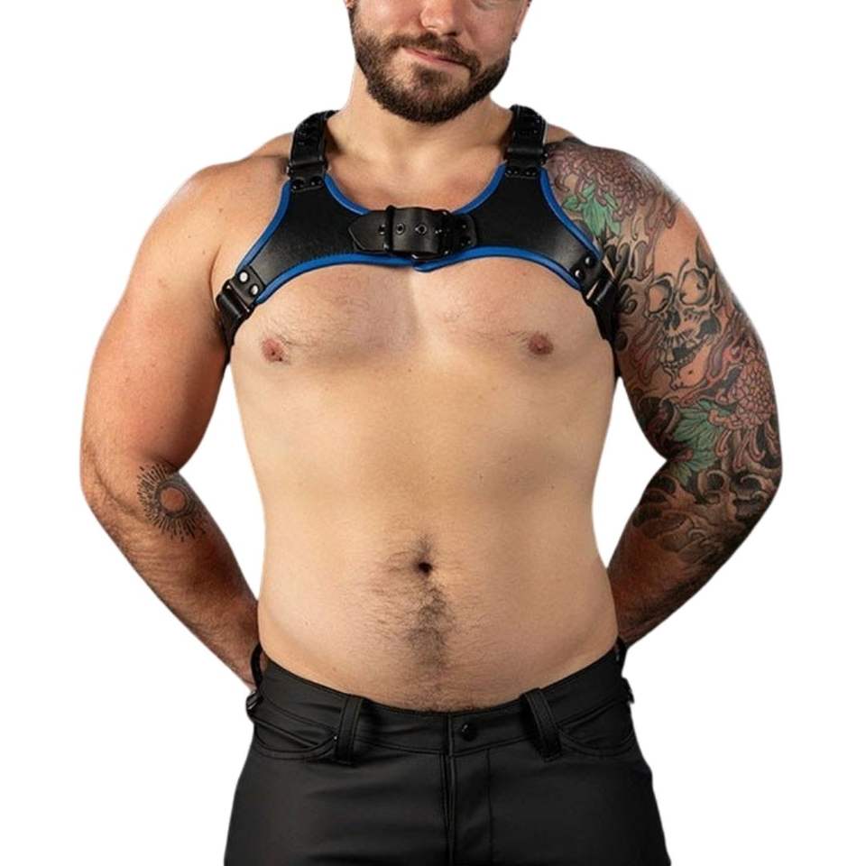 Mens Centurion 2.0 Leather Chest Harness Blue Adjustable Straps Premium Leather Club Wear Body Harness