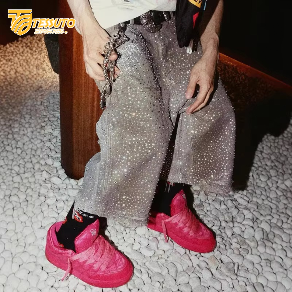 Mens Custom Summer Distressed Denim Jogger Sweat Shorts Baggy Puff Print Embroidery Rhinestone with Acid Wash French Terry