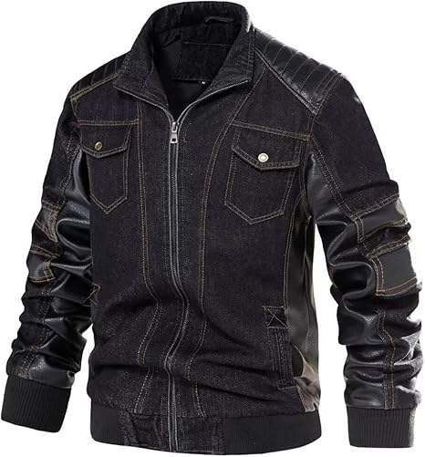 Mens Denim & PU Leather Biker Jacket Vintage Motorcycle Jean Jacket with Leather Patchwork