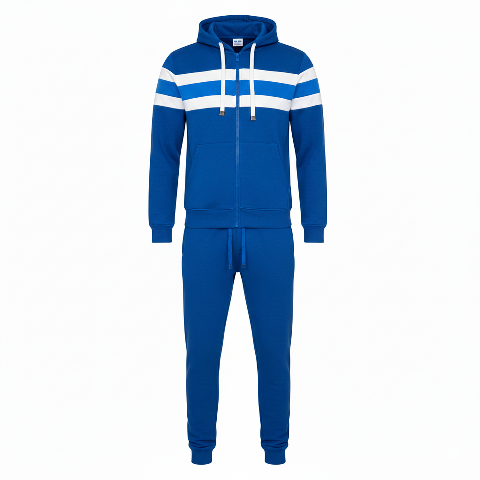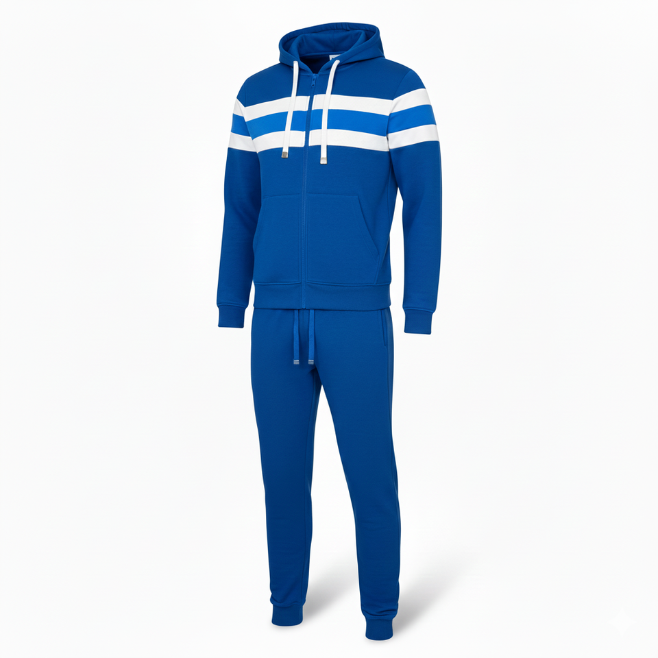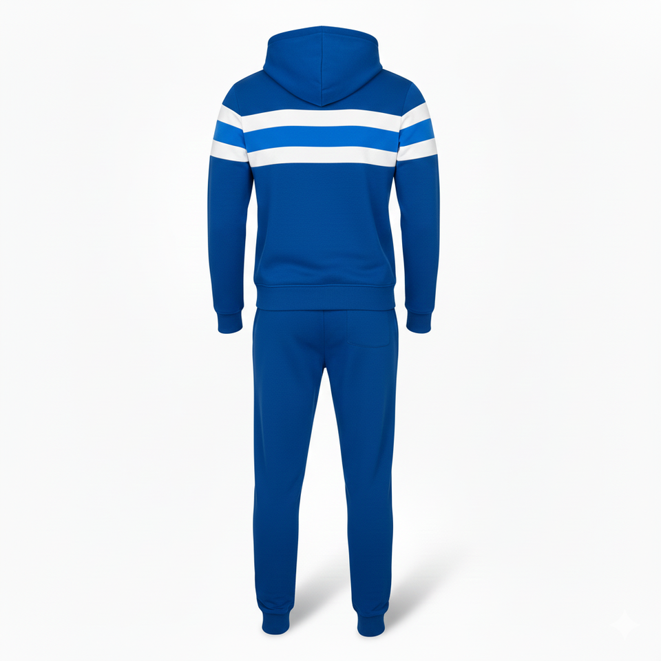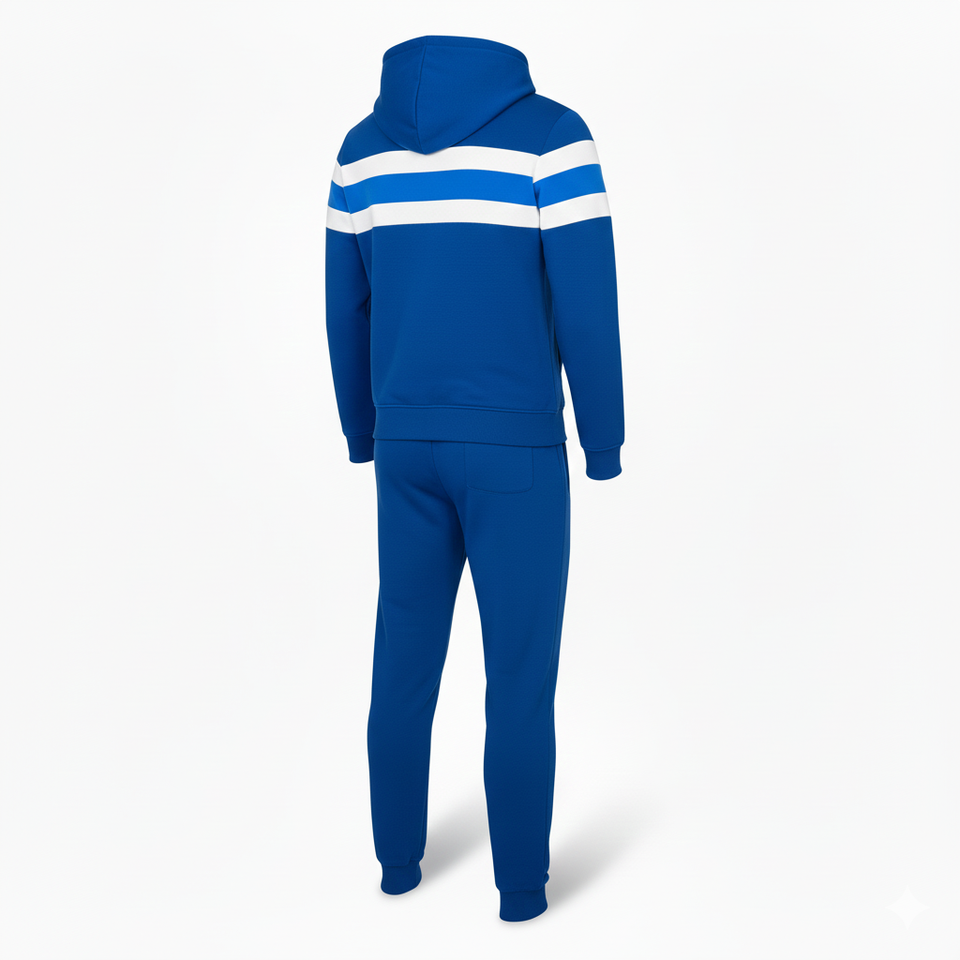 Mens Full Zip Smart Fit Hoodie & Jogger Tracksuit Set in Royal Blue Soft Cotton Blend Fleece with Contrast Sport Stripes