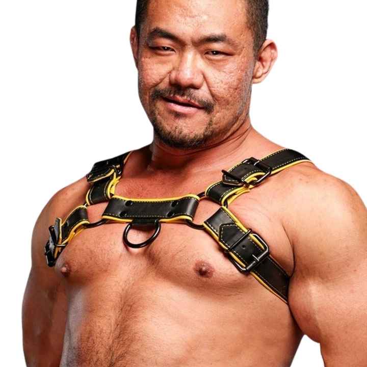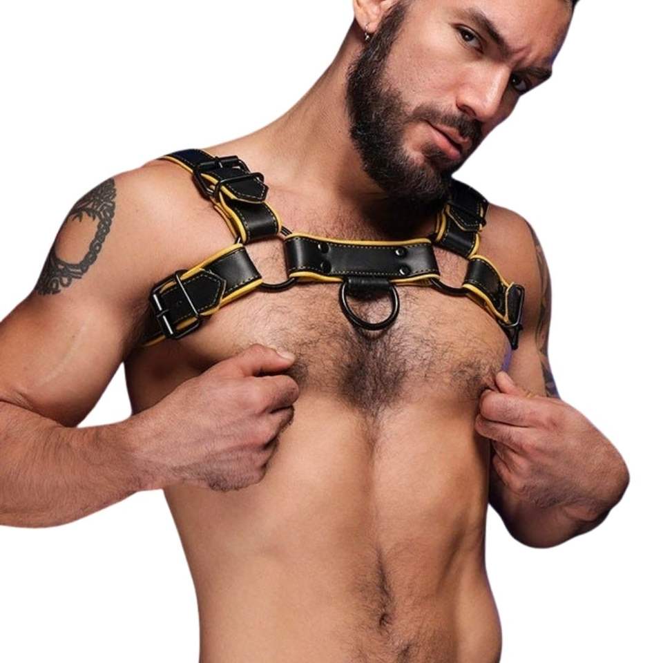 Mens Hardline Bulldog Faux Fur Harness Yellow Lace Trim Adjustable Chest Fit Premium Club Wear Sexy Costume