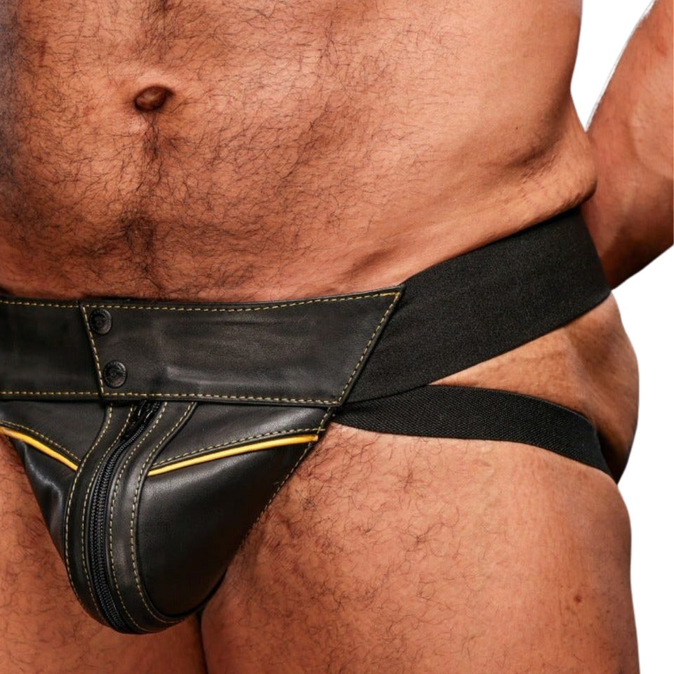 Mens Hardline Leather Jockstrap Yellow Trim Athletic Style Premium Leather Fetish Underwear Adjustable Straps