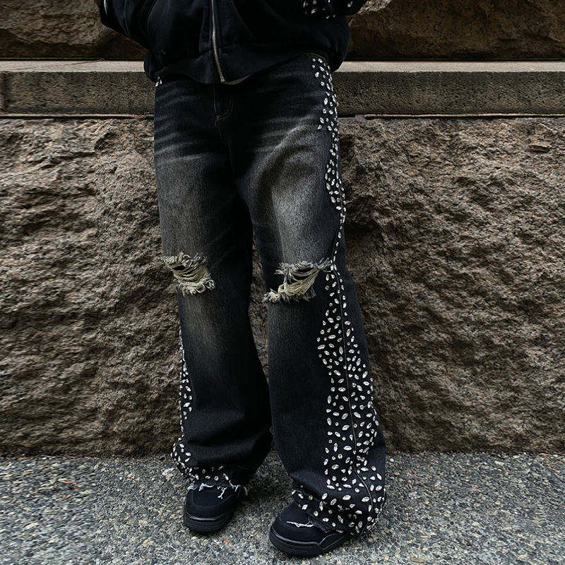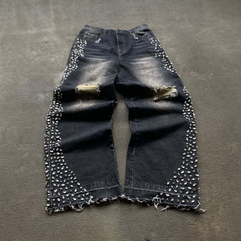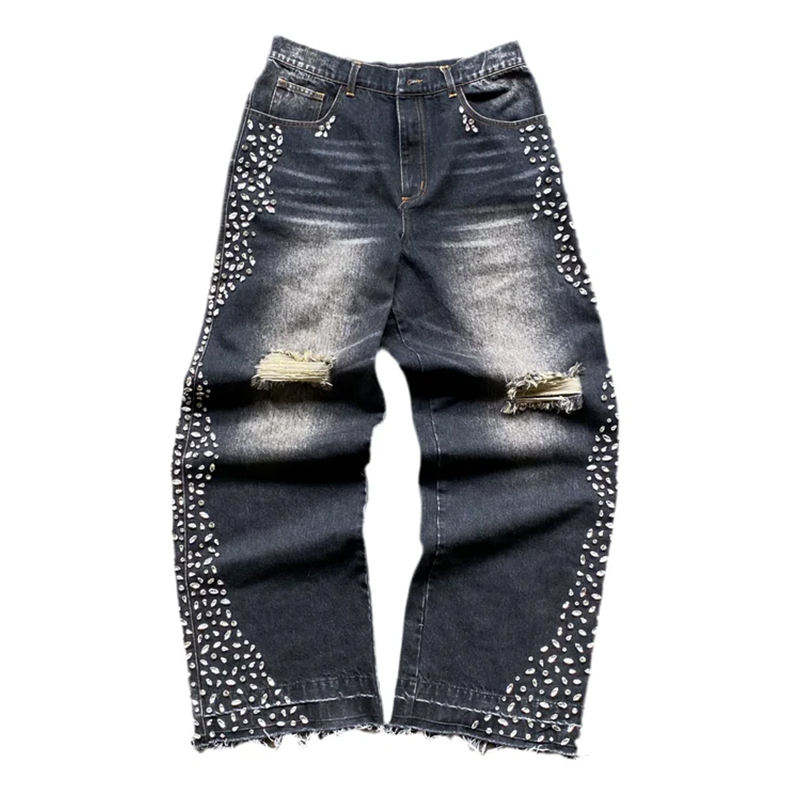 Mens High Waist Streetwear Vintage Fashion Jeans Custom Design with Gemstones Stone-Washed Denim Hip-Hop Style