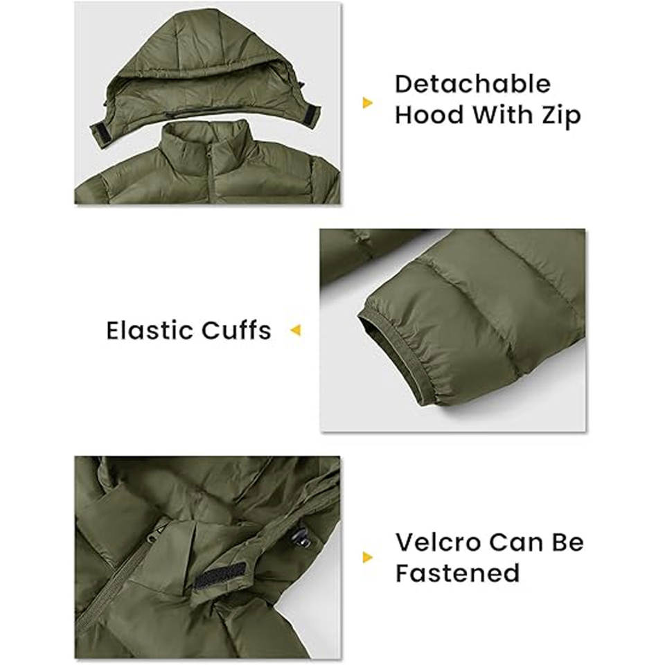 Mens Lightweight Hooded Puffer Jacket with Detachable Hood Water-Resistant Insulated Winter Coat Pockets OEM Custom Logo