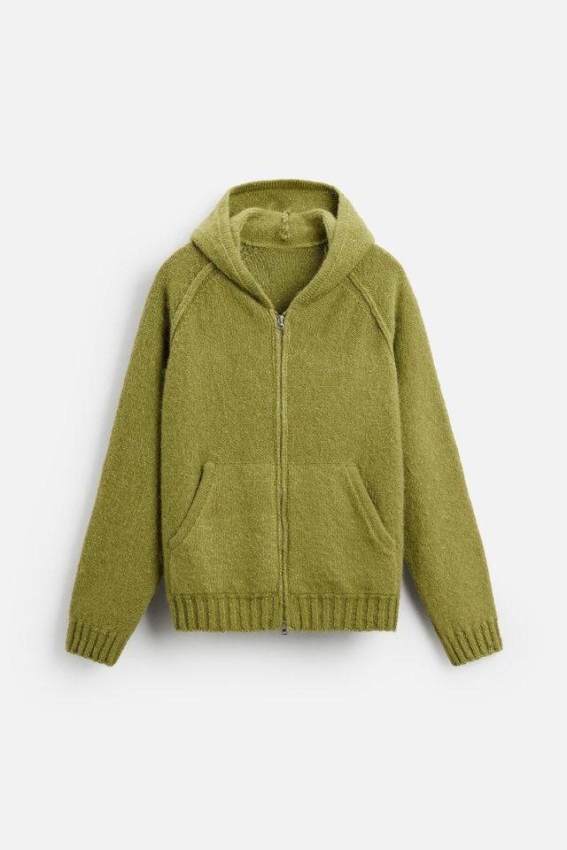 Unisex Lightweight Olive Green Boucle Knit Full Zip Rhinestone V-neck Hoodie Sweater Cardigan Button Accents Solid Spring