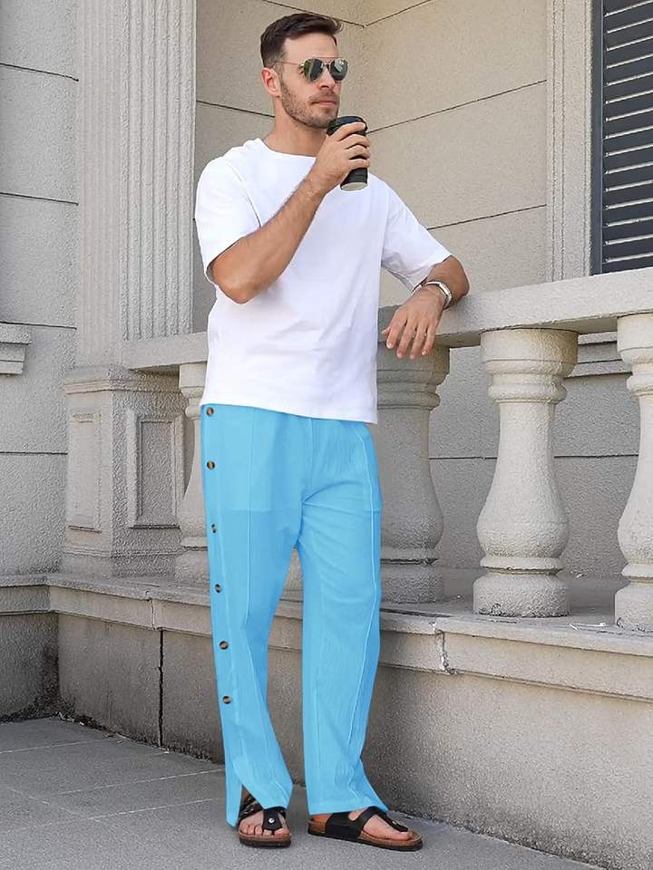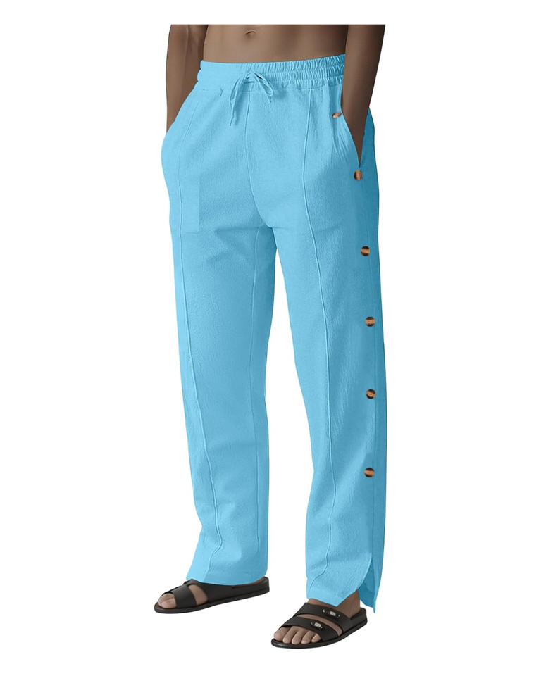 Mens Linen Pants Summer Casual Button Straight Beach Pants Baggy Elastic Waist Drawstring Yoga Trousers with Pockets