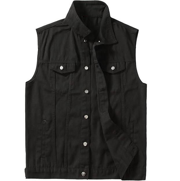 Mens Plain Black Sleeveless Denim Vest Jacket Multi-Pockets Jeans Vest Jacket Solid Color Casual Outerwear for Spring and Autumn