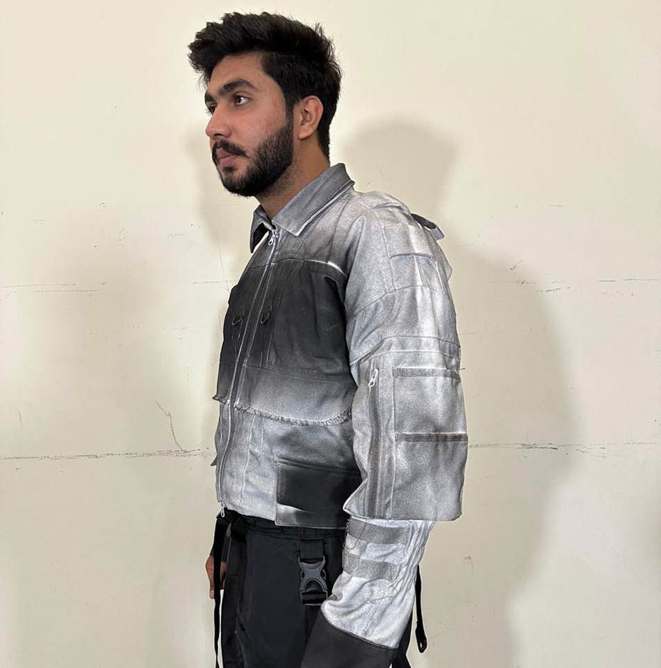 Mens Reflective Techwear Jacket Silver Black Gradient Streetwear Bomber Zip-Up Tactical Fashion Outerwear