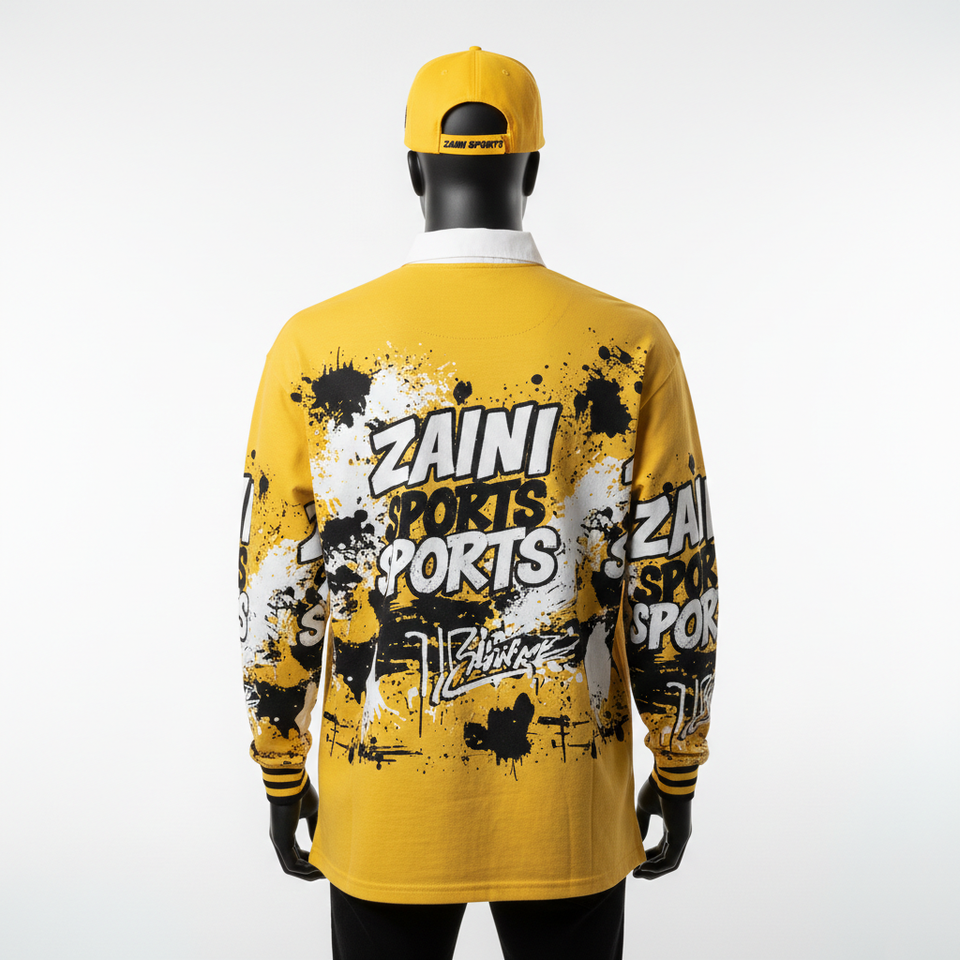 Mens Rugby Shirt Premium Polyester Cotton Blend 260 GSM Sublimation Printed Yellow Black Panel Design moisture wicking