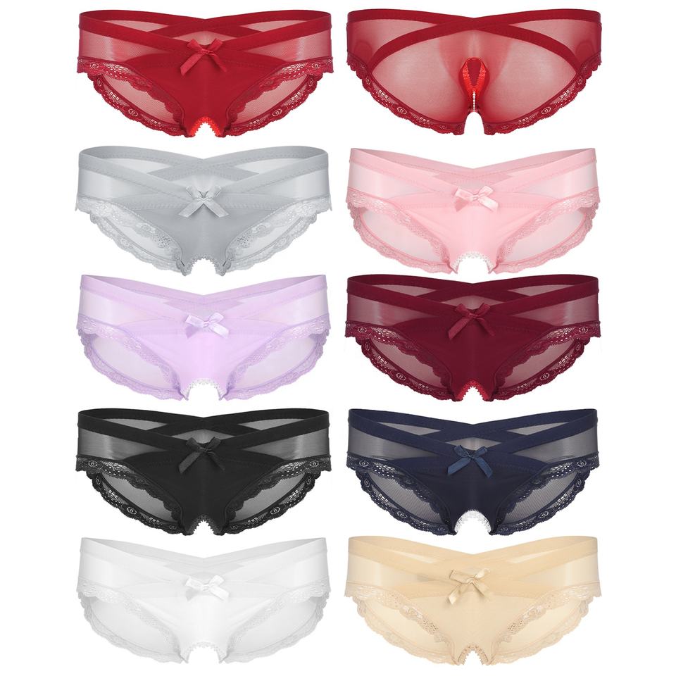 Mens See-Through Crotchless Briefs Low Rise Lace Trim Underpants Sissy Underwear Tight Panties