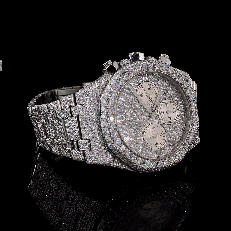 Mens Silver Diamond Watch Iced Out Chronograph Custom Fully Paved Bracelet Luxury Hip Hop Jewellery Timepiece moissanite diamond