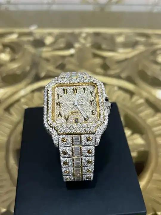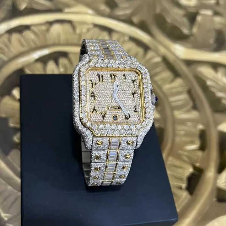 Mens Silver Stainless Steel Moissanite Diamond Glass Watch Black Square Case Analogue-Digital Display Luxury ETA Quartz Movement