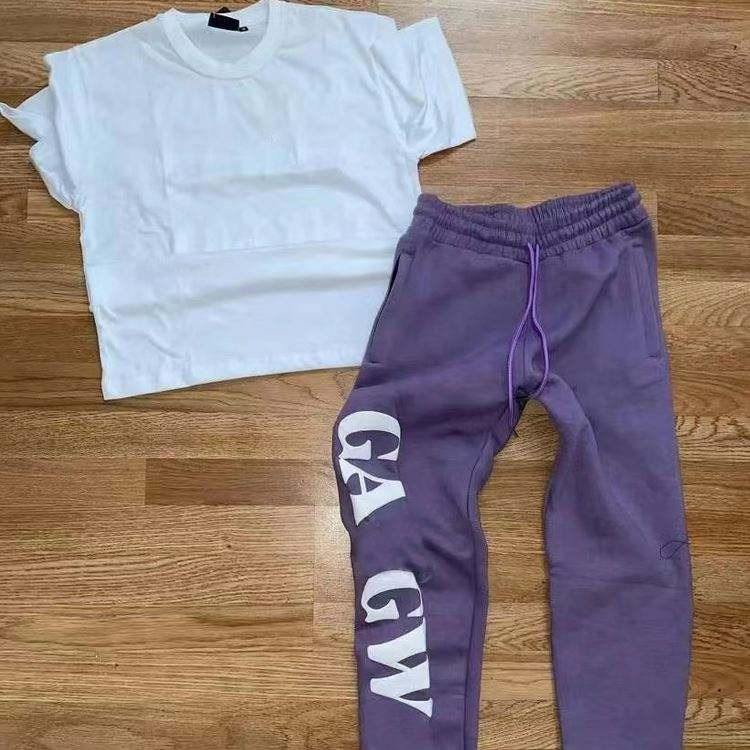 Mens Sweat Suits Wholesale 100% Cotton Sweatsuit Short Sleeve Puff Print Men Jogger Suit Tracksuits for Men Purple